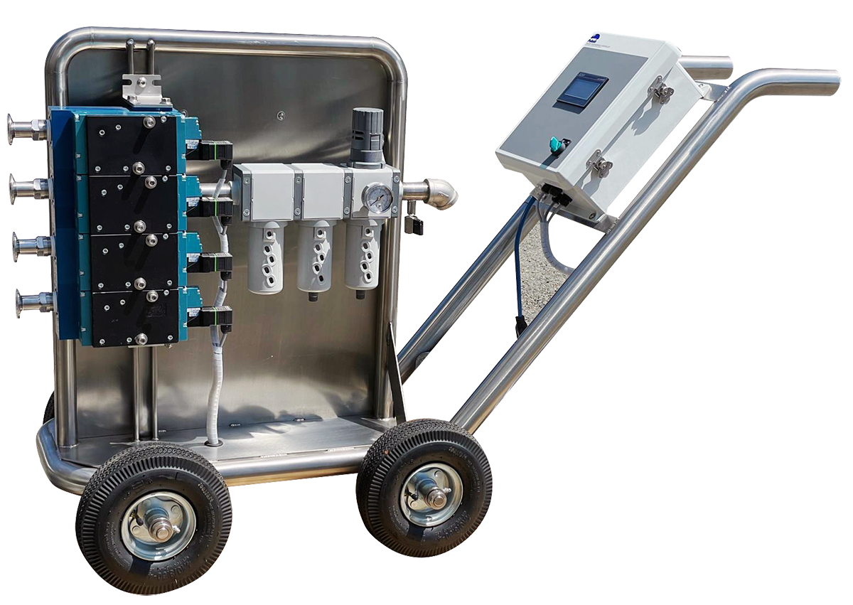 The Pulsair Wine Cart is designed as a mobile semi-automatic cap management and wine blending system. The Wine Cart can be used for large wine fermentation tanks, totes and smaller fermenters. The stainless steel cart utilizes a state of the art touch screen programmable controller and a stack of injection valves that are connected to injection ports in a fermentation or blending tank. The connections from the cart to the tank are made using flexible hoses and tri-Clover flanged check valves. Also included are three clean air filters which supply food grade air to the wine to ensure quality.